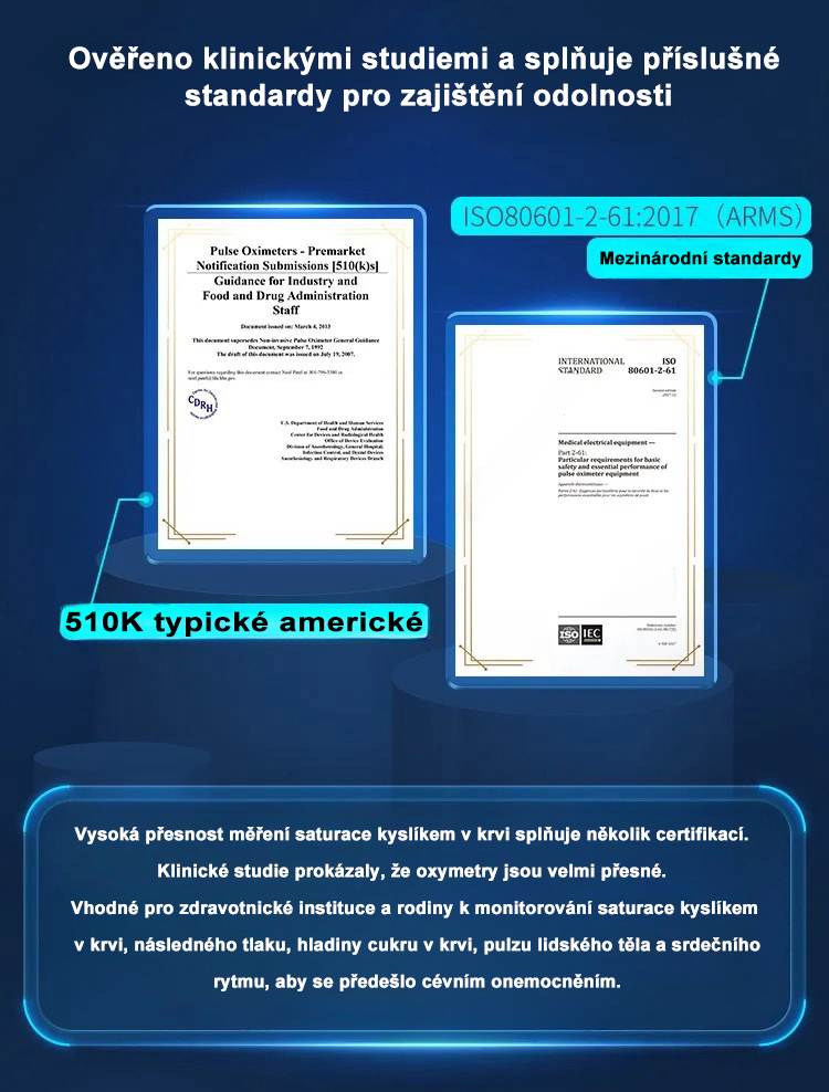 Tento lékařský glukometr splňuje evropskou certifikaci CE, americkou certifikaci FDA a certifikaci CFDA.